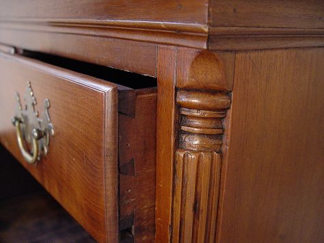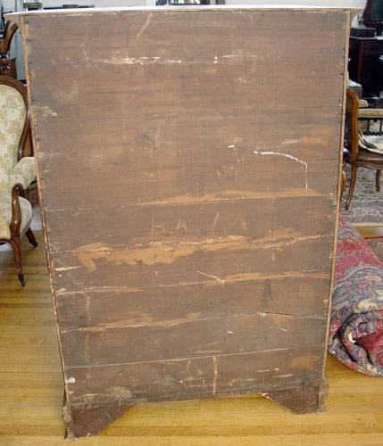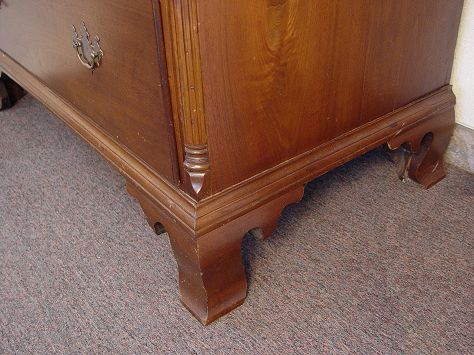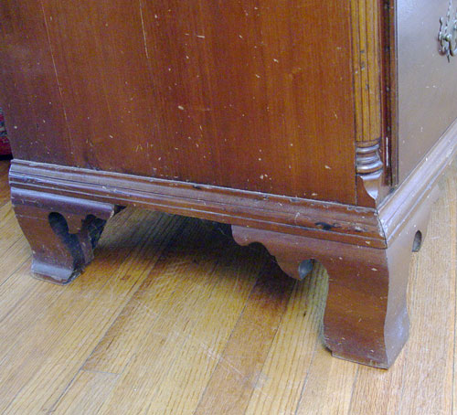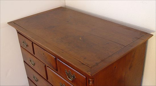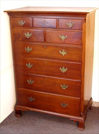 19th C AMERICAN CHIPPENDALE STYLE TALL CHEST: Flat top with overhanging cornice. 9 drawer chest having 3 over 2 half length over 4 full length. Fluted columns, bracket feet. 60 1/4''h. x 42 1/2'' x 24''.