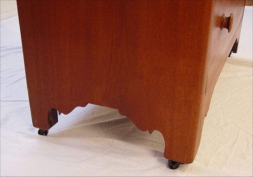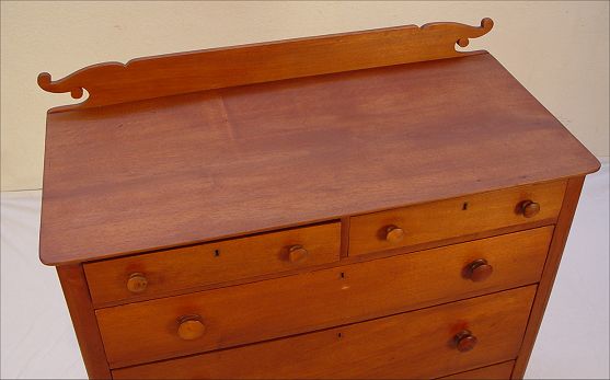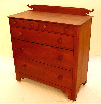 19th C COUNTRY CHIPPENDALE CHEST: 2 half length drawers over 3 full length drawers graduating depth. Shaped backsplash, shaped skirt. Dovetail construction, panel back. 46''h. x 41 1/4'' x 20''.