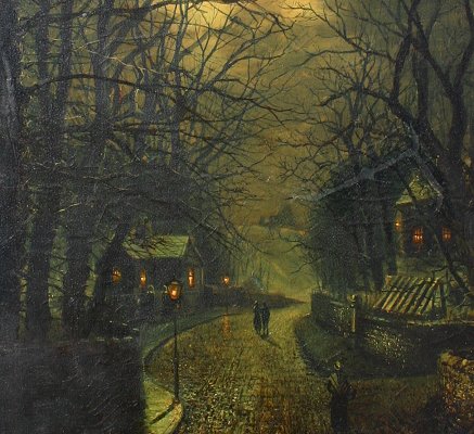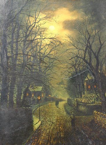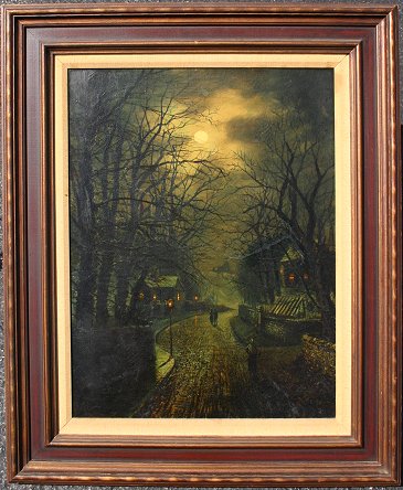 MEEGAN, Walter, (British, 1859-1944): Moonlit Street Scene, O/C, 24'' x 18'', signed, framed, 32'' x 25''. Extensive restoration, relined, repairs to tears, cracklure throughout, needs cleaning, sold as is.