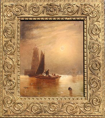 AMERICAN SCHOOL 19TH C. HARBOR SCENE: O/C, Hauling in the nets at dusk, 12'' x 10'', unsigned, period overpainted gilt frame, 17 1/2'' x 15 1/2''. Needs cleaning, a small spot of overpaint and repair in sky. Est. $400/600**