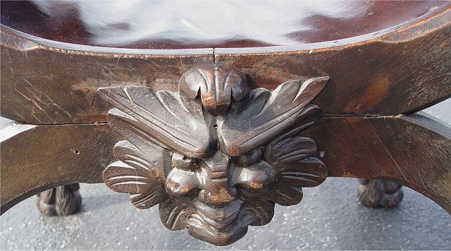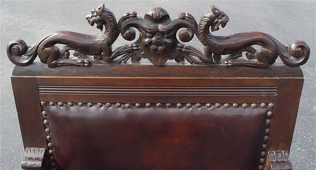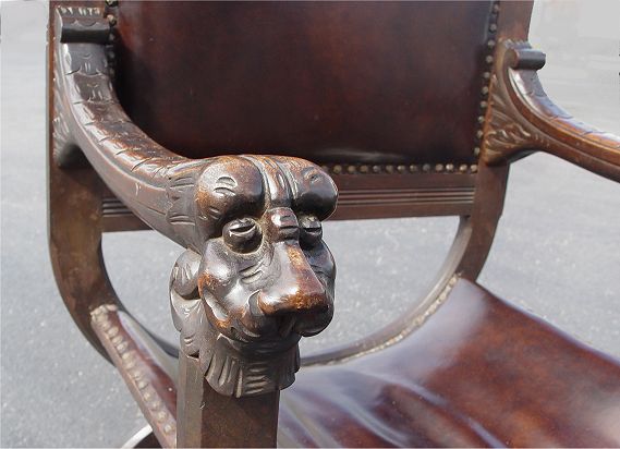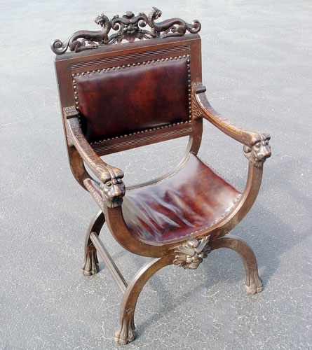 CARVED MAHOGANY SAVONAROLA CHAIR: Lavishly carved figural top rail and hand holds, cordovan leather seat and back. 44''h. x 24'' x 20''