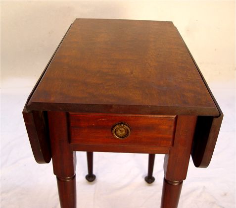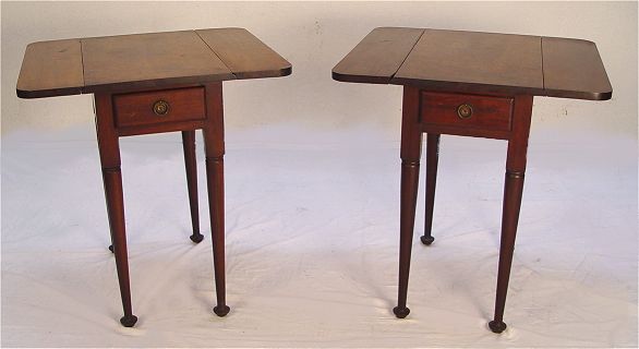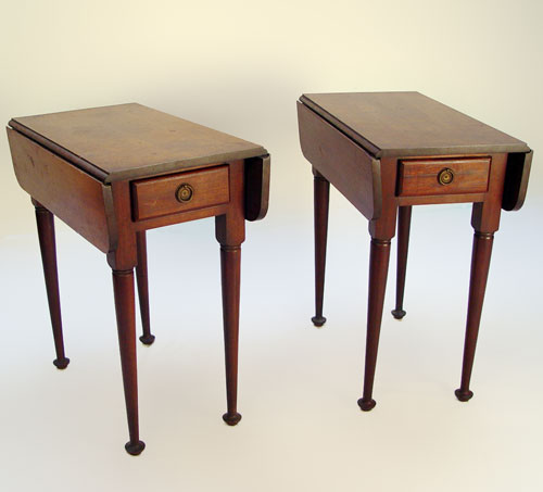 PAIR DIMINUTIVE 19TH C AMERICAN COUNTRY DROP LEAF TABLES: Mahogany, one drawer side tables. 26''h. x 14 1/2''w. x24''. 25'' wide with leaves extended.