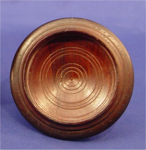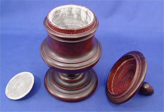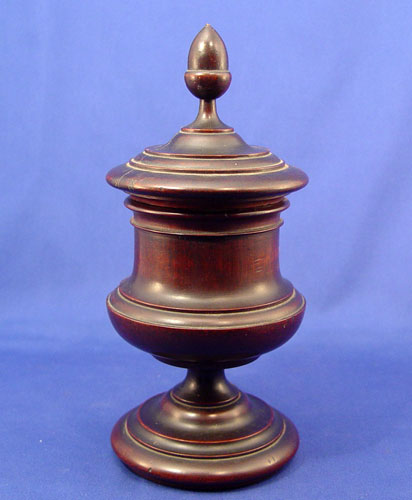 TREEN TOBACCO JAR: Turned mahogany with metal lined interior and lid. Acorn finial on the exterior cover. 11''h. Please note repair on lid.