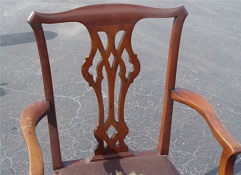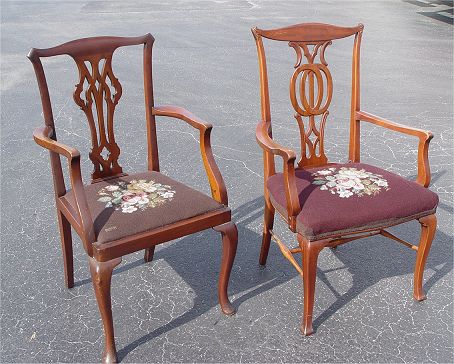 SET OF 6 19TH C MAHOGANY DINING CHAIRS: Matched set of 5, one being an arm chair. Sold with an companionable arm chair to make the set of 6. Pierced back splats., needlepoint seats. 39 1/2''H. x 19 1/2'' x 19''.