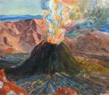 IMPRESSIONIST VOLCANO PAINTING CIRCA 1930: O/C/B, 20'' x 22'', unsigned, framed, 26'' x 30''. Canvas laid on board, has areas of thin or missing paint, needs cleaning.