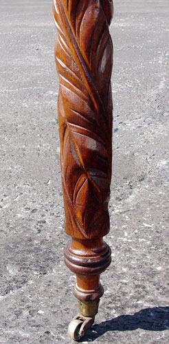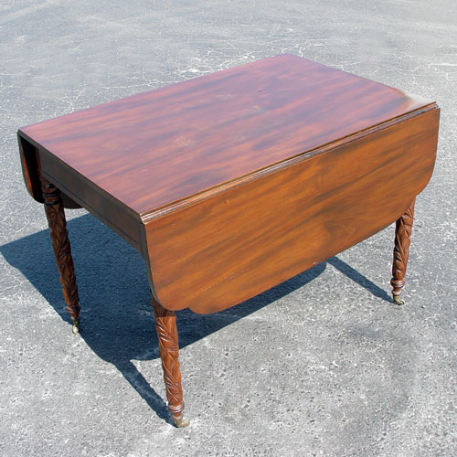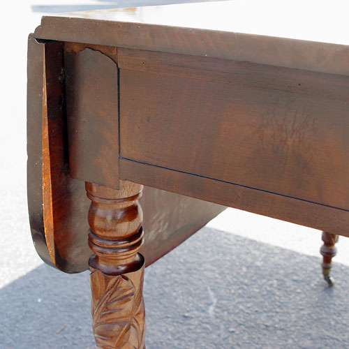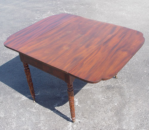 FEDERAL CARVED MAHOGANY DROP LEAF TABLE: Leaf carved legs on casters. 28''h. x 40''l. x 26 1/2'', with the shaped leaves extended the table to 65''.