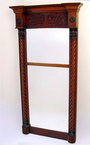 19TH C FEDERAL MAHOGANY MIRROR: Spiral carved side columns, two mirrors divided, upper and lower. Relief carved panel above the mirrors. 34 1/2'' x 18 x 6''.