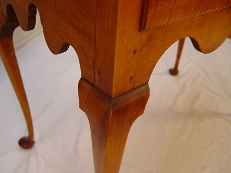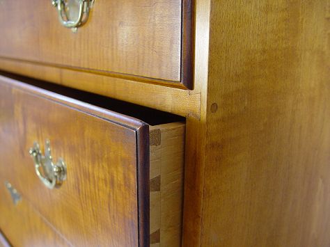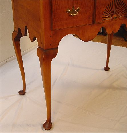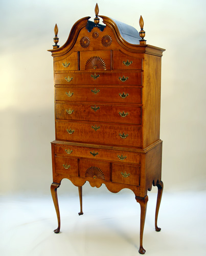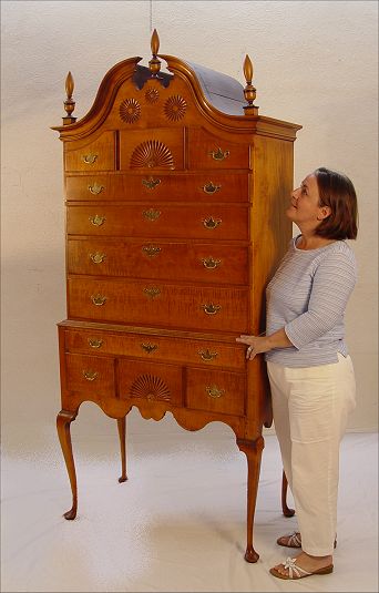 ELDRED WHEELER TIGER MAPLE BONNET TOP HIGHBOY: Tall highboy typical of the Wethersfield CT area. Chest on stand with 11 drawers, carved shell and pinwheels, raised high on Queen Anne legs. Bears the Eldred Wheeler label. Eldred Wheeler, Hingham, MA., ''one of the nation's premier designers and builders of 18th Century country high style furniture''. 86 1/2''h. x 37 3/4'' x 20''. Retail list price $9190. Est. $4500/5000**