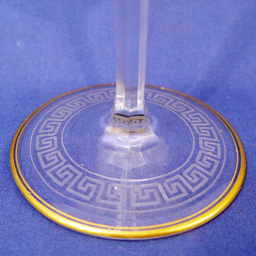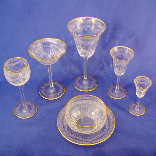 75 pc SUITE OF FINE ETCHED CRYSTAL STEMWARE: Etched in a swag design with gold border. Includes 9 water goblets (8 1/4''), 11 champagnes, 7 wine hocks, 10 red wine clarets, 2 white wine, 11 cordials and 10 fruit bowls with underplates. Est. $500/800**