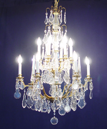 ELEGANT BRONZE AND CRYSTAL 12 LIGHT CHANDELIER: French pendalogue prisms, faceted crystal ball and tall crystal finials. Hangs 40'' from canopy, 24'' dia. Brass ? or bronze.