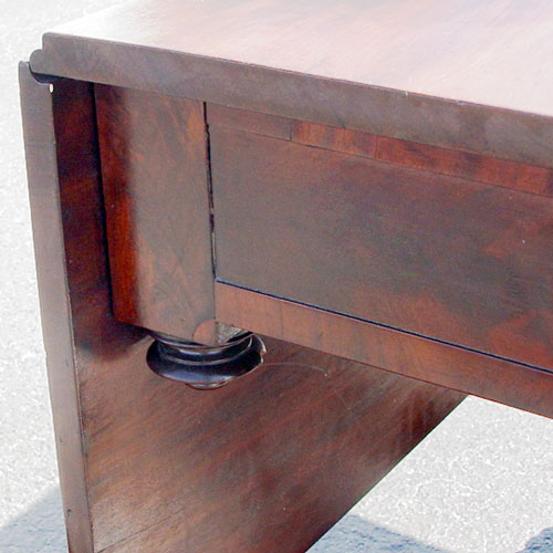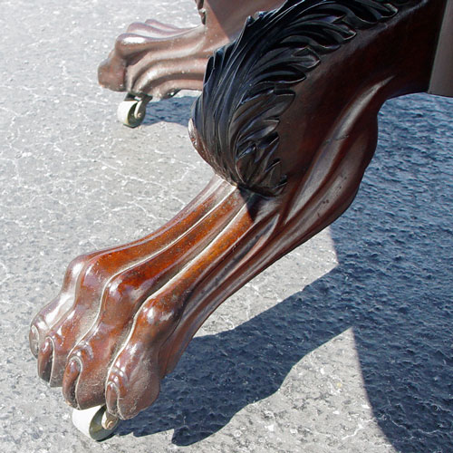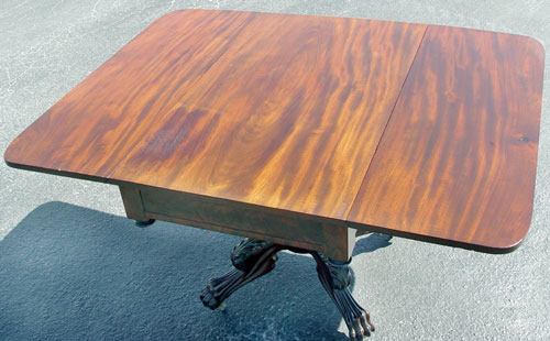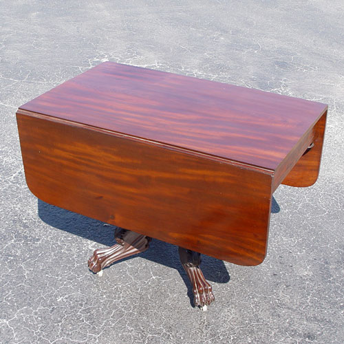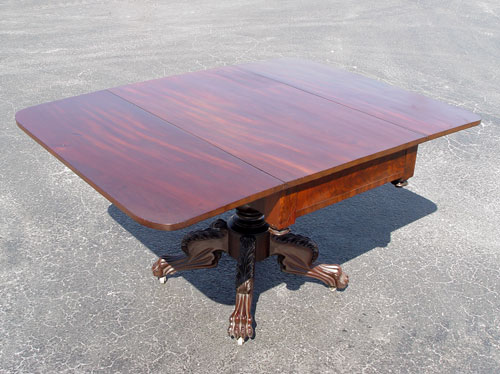 RICHLY CARVED FEDERAL MAHOGANY DROP LEAF TABLE: The pedestal base with four acanthus leaf carved legs ending in paw feet. 28 1/2''h. x 23 1/2'' x 40''. With the leafs raised the table is 53 1/2'' long.