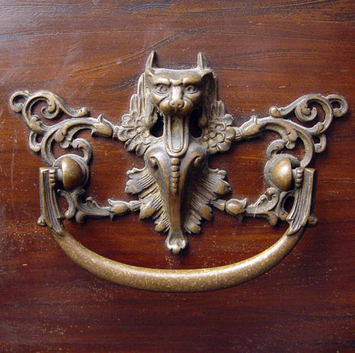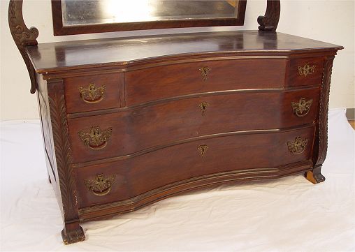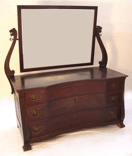 HORNER QUALITY CARVED MAHOGANY DRESSER AND MIRROR: Featuring winged griffin pulls, carved griffin head mirror arms, paw feet and elongated acanthus leaf stiles. Three drawers across the top over two full length drawers. Concave front, adjustable angel mirror. 68 1/4''h, x 5' long x 27'' deep. The chest minus the mirror stands 10 1/2''h. Please call for condition.