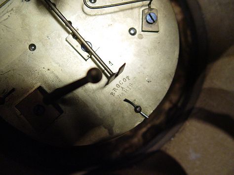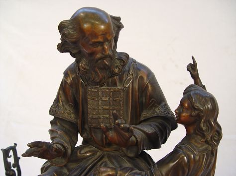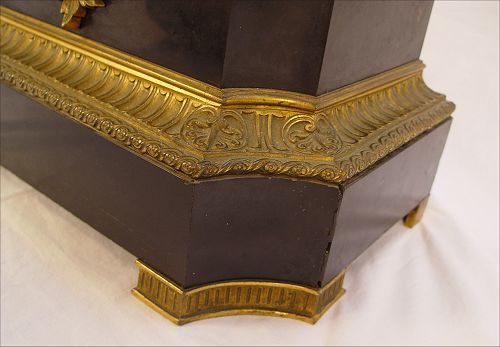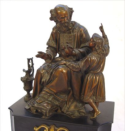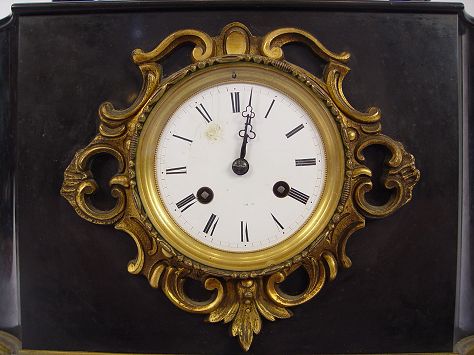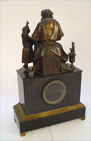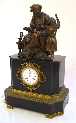 HUGE BROCOT 19TH C BRONZE AND MARBLE FIGURAL CLOCK: Black marble clock surmounted by bronze statuary. Works marked Brocot, enamel dial (note chip), bell strike, pendulum included. 28''h. x 17'' x 10''.