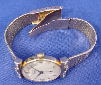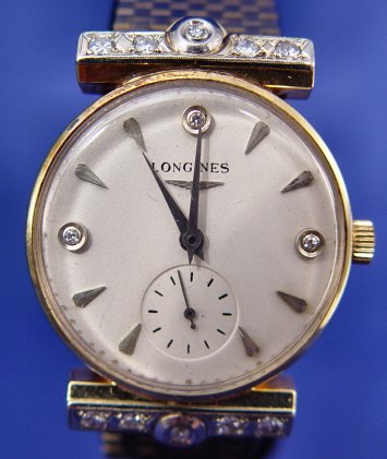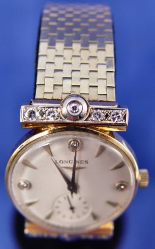 GENTLEMAN'S 14K & DIAMOND LONGINES WRISTWATCH: Mesh bracelet, case and clasp of 14k yellow gold, lugs set with 10 small diamonds, dial with satin finish set with three smaller diamonds. Back of case marked 14k, inside back Longines-Wittnauer Watch Co Inc New York 14k 217082, works marked Longines Watch Co. Swiss 17 jewel 9098983 22L Unadjusted LXW. Without works 49.5 grams, overall 55.5 grams. All clocks and watches are sold as not working, due to their delicate nature, even though they may be just fine. This handsome watch is currently keeping time. Est. $1000/1500**