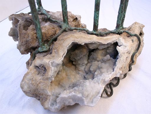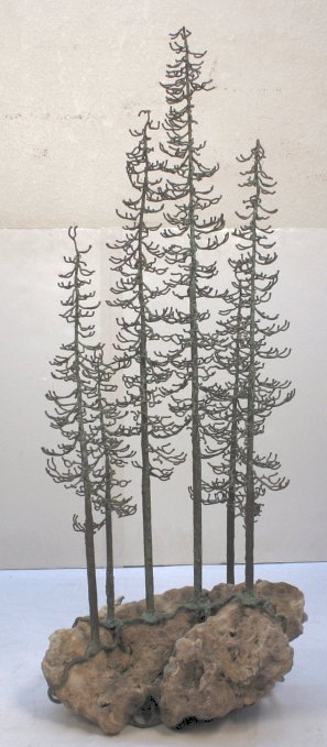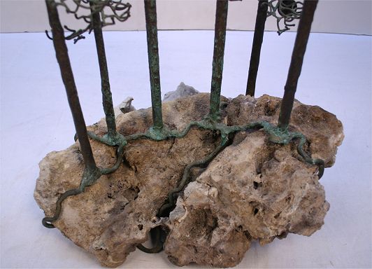 BRONZE AND GEODE TREE SCULPTURE BY BELVA BALL: Contemporary American artist. Six patinated bronze trees with the bronze root system intertwined with the geode base. Bronze nameplate inscribed ''Belva Ball''. 42''h., the base is 18'' x 15''.