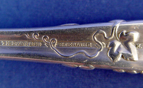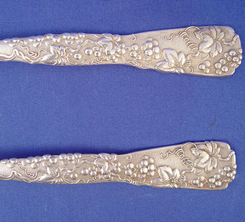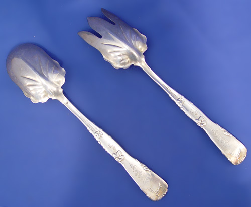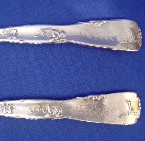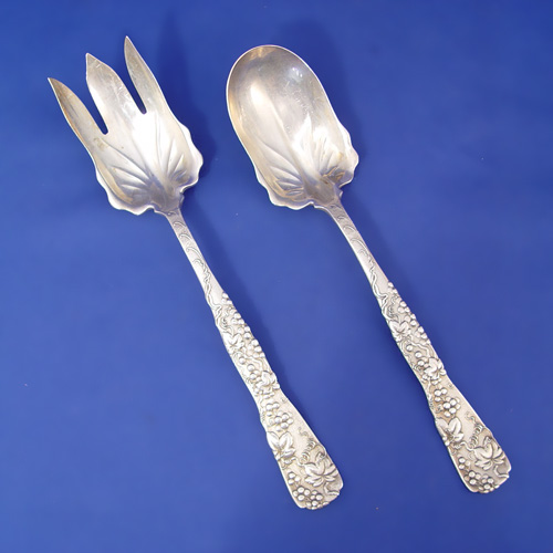 TIFFANY & CO VINE-GRAPEVINE STERLING SALAD SERVERS: Ca. 1872. Salad serving fork and spoon, 10''l. Monogrammed MRP verso.