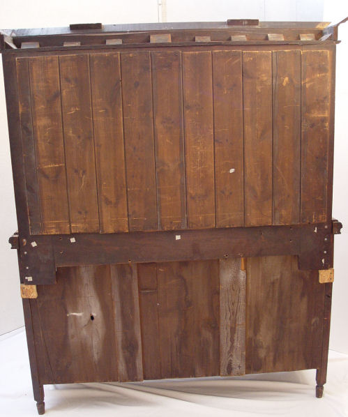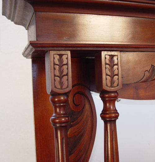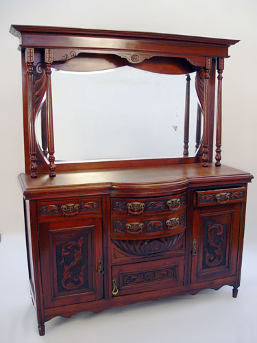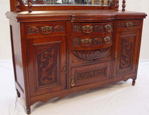 CARVED MAHOGANY SERVER WITH MIRRORED BACKSPLASH: Straight cornice over a shaped and beveled mirror, overhanging and bowed center drawers. Relief carvings to the drawer fronts and doors. 73 1/2'' x 59'' x20''.