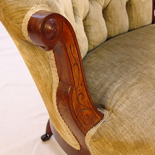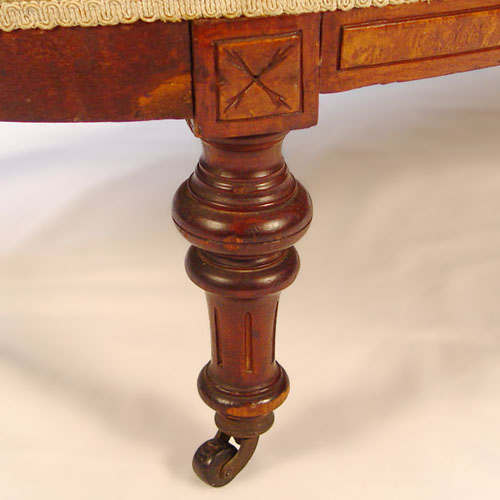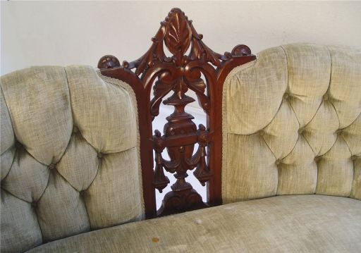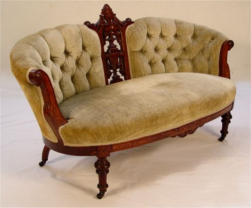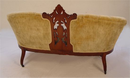 HIGH VICTORIAN SETTEE CA 1890: Pierced and carved back center and crest cradled in tufted velvet. Incised carvings on the skirt, turned legs. 33''h. x 58'' tx 29''. Est. $500/800**