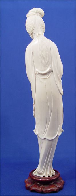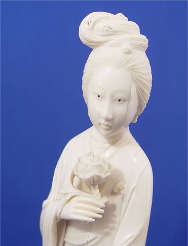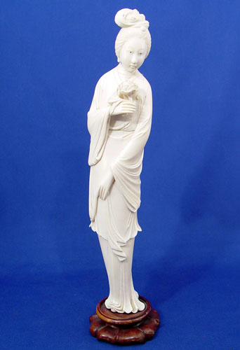 CARVED IVORY QUAN YIN FIGURE: With lotus flower in hand, 12''h. Please note age cracks. Sold with the wood stand. Est. $400/600**