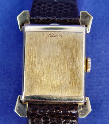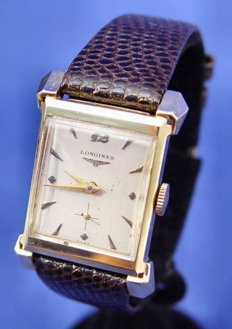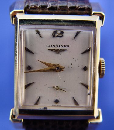 GENTLEMAN'S 14K LONGINES WRISTWATCH: Simple elegant watch of 14k yellow gold case on a brown leather band, 8 7/8''l. Back of case marked 14k, inside back Longines-Wittnauer Watch Co Inc New York 14k 117786, works marked Longines Watch Co. Swiss 17 jewel 8731604 9LT Unadjusted LXW. All clocks and watches are sold as not working, due to their delicate nature, even though they may be just fine. This watch is currently keeping time.