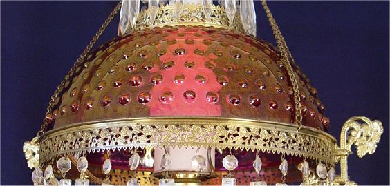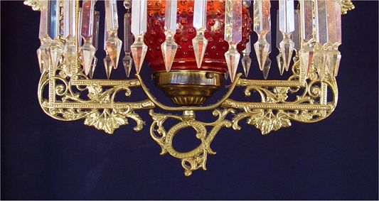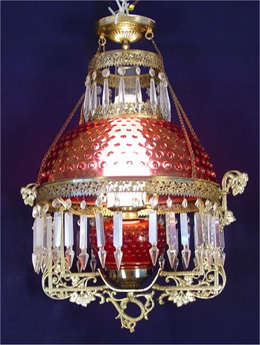 VICTORIAN CRANBERRY HOBNAIL GLASS CHANDELIER: Glass font and shade, flashed color, crystal prisms, gilt metal and brass frame. The shade is 14'' dia., lamp hangs 21''.