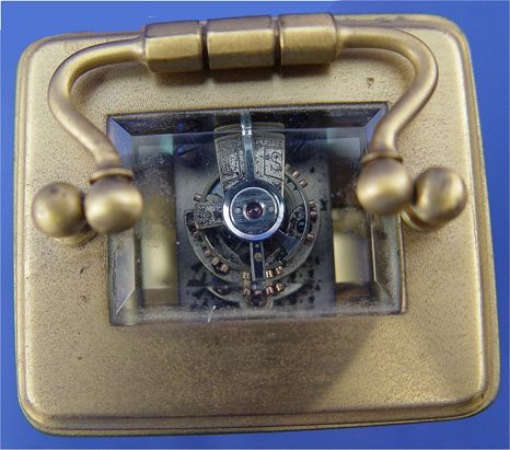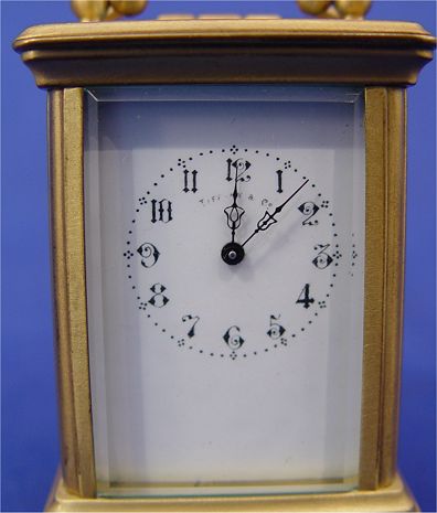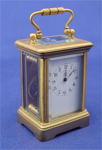 MINIATURE FRENCH CARRIAGE CLOCK FOR TIFFANY & CO.: Brass case with 5 beveled crystals. The enameled dial is Marked ''Tiffany & Co.''. No key, 3'' x 2'' x 1 5/8''.