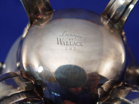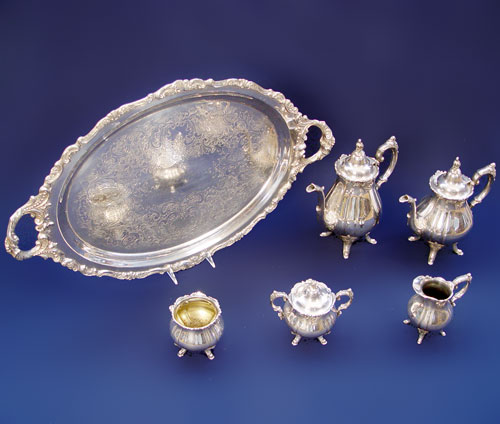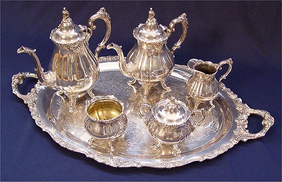 WALLACE BAROQUE SILVERPLATE TEA SERVICE: 7 piece set includes 29'' oval tray, coffee and tea pots, covered sugar, cream pitcher, and waste pot. No monogram.