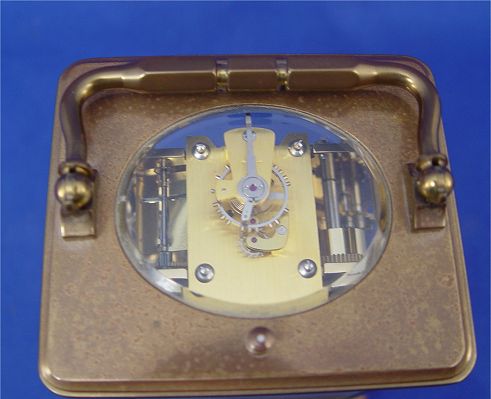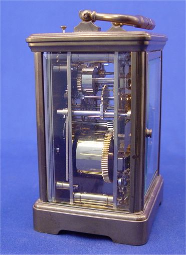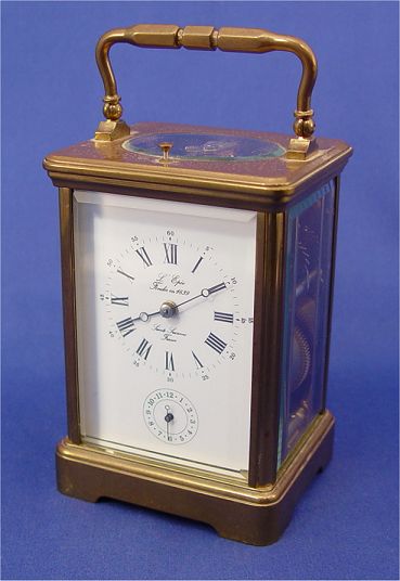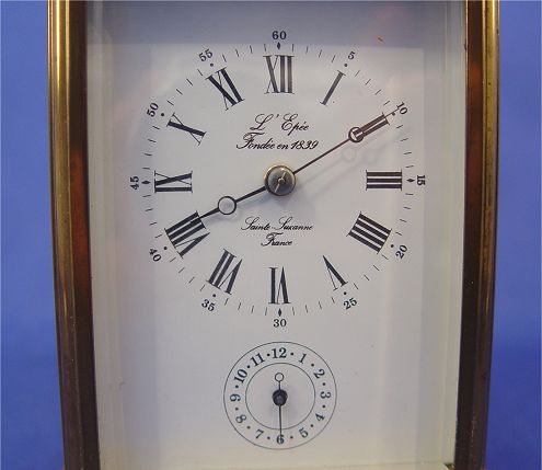 FRENCH REPEATER CARRIAGE CLOCK : Brass with beveled crystals, enamel dial states ''L'Epee Fondee en 1839'' and ''Sainte Luxanne France''. Roman numerals mark the hour, Arabic mark the minutes and seconds. No key. 5 1/8''h. x 3 5/8'' x 3''.