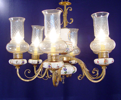 EUROPEAN PORCELAIN FAIENCE CHANDELIER: Etched glass shades, 6 light.