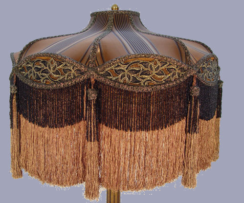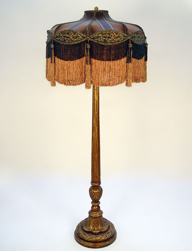 OUTRAGEOUS TURN OF THE CENTURY FLOOR LAMP WITH BEADED AND FRINGED SHADE: Gilt wood base capped with a shade heavy with fringe. The silk fringe is 10''long, the beaded fringe layer over the silk fringe is 3 1/2''. Shade is 27'' dia., the lamp is 71''h.