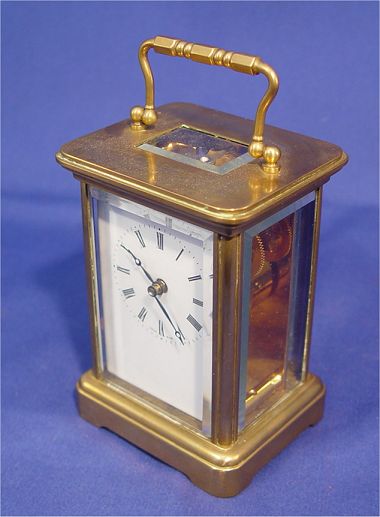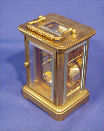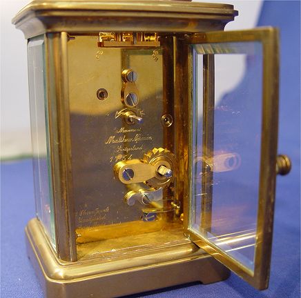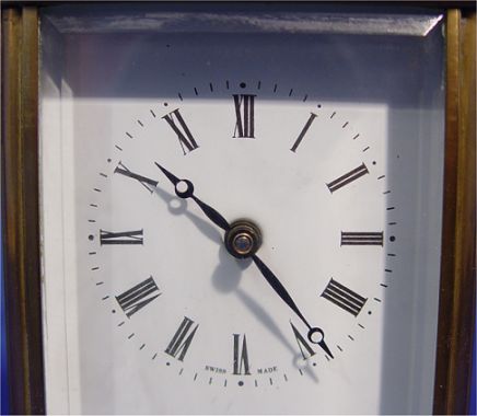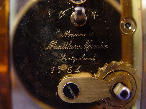 SWISS CARRIAGE CLOCK: Brass and beveled glass case, enamel dial with Roman numerals, works are signed ''Movement Matthew Norman Switzerland'', 11 jewels. The top has a later inscription to Larry Christian February 1, 1986. 4 1/4 x 3 1/8'' x 2 3/4''. In working order.