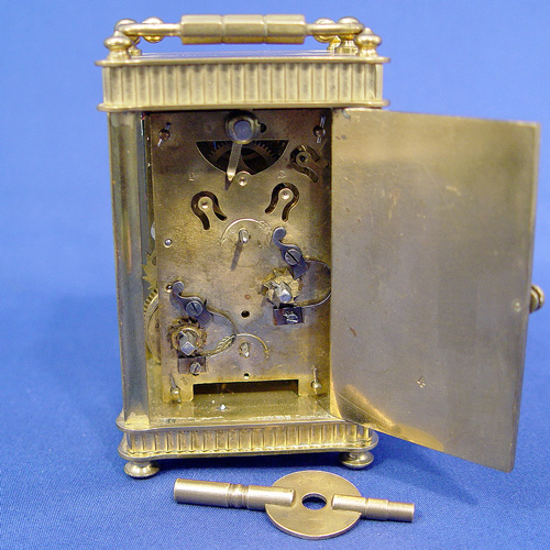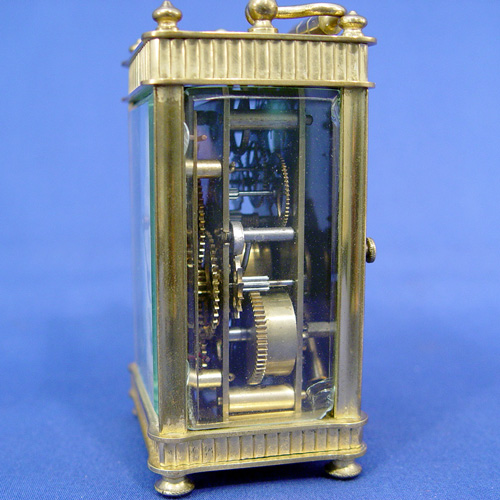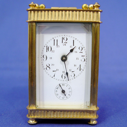 BRASS CARRIAGE ALARM CLOCK: Brass and crystal, second and hour dial, Arabic numerals. Three beveled glass crystals and engraved brass back, pivot handle. Key included, chip on one glass and corner of face. 4 1/4'' x 2 1/2'' x 2''.