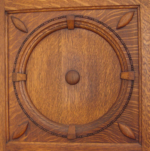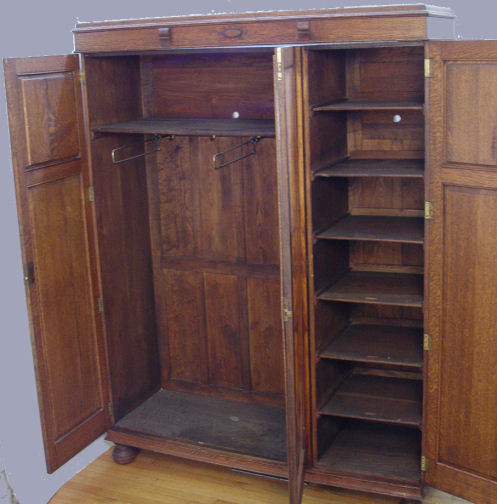 GOLDEN OAK 3 DOOR ARMOIRE: Generous storage created by fine features. Behind one door are 6 slide out shelves. The center mirrored door opens along with the side door for a large space with slide out hanging rods. Carved medallion on the two side doors. 81''h. x 60'' x 20''.