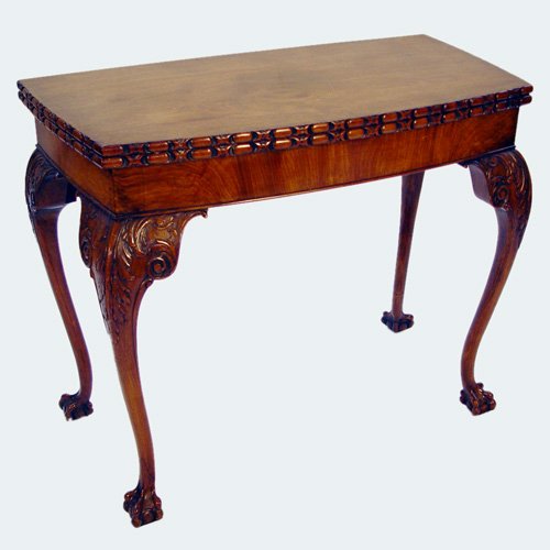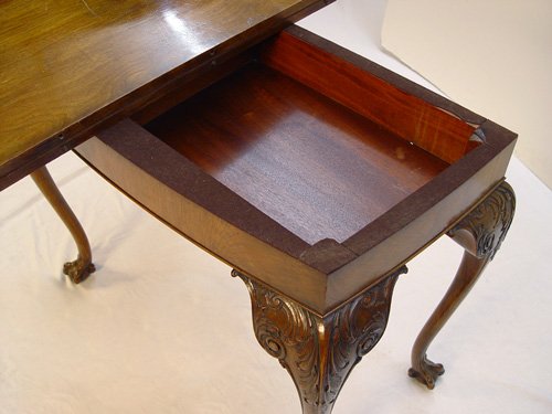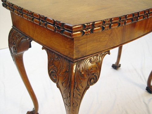 CHIPPENDALE STYLE GAME TABLE, CA 1900: Flip top with handsomely carved edges, carved knees on the cabriole legs, ball and claw feet. Felt top, opens to 36'' x 36'', #30'' tall. Est. $1500/1800**