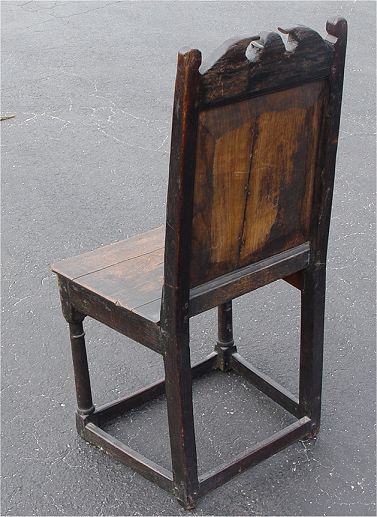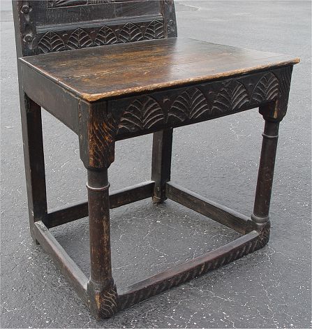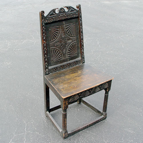 EARLY ENGLISH CARVED OAK SIDE CHAIR: Believed to be Charles I, note the stretchers at floor level. Said to have come from ''God's Providence House'' an inn and stage coach a days journey from London. The chairs were brought to the US in the 1800's.
