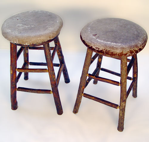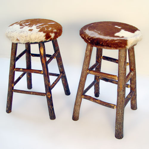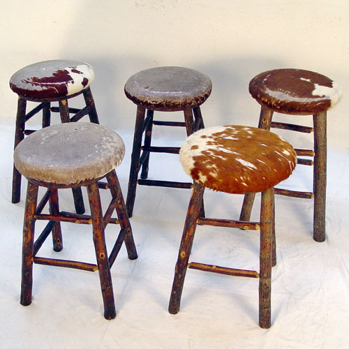 SET OF 5 ADIRONDACK HICKORY COUNTER OR BAR STOOLS: Revolving round seats. Sturdy structure, please note loss of fur some of the cowhide, one stool has a rung missing. 29 1/2''h. 17'' dia.