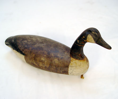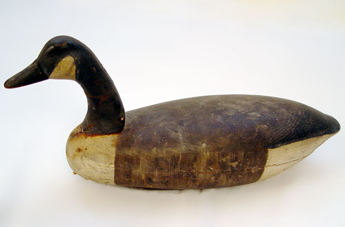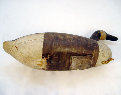 CARVED GOOSE DECOY: Original paint, the lead weight plate is impressed RB or RR. 11''h. 24''l.