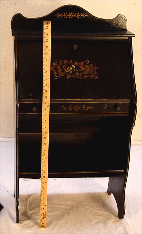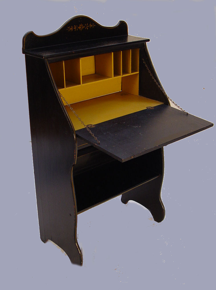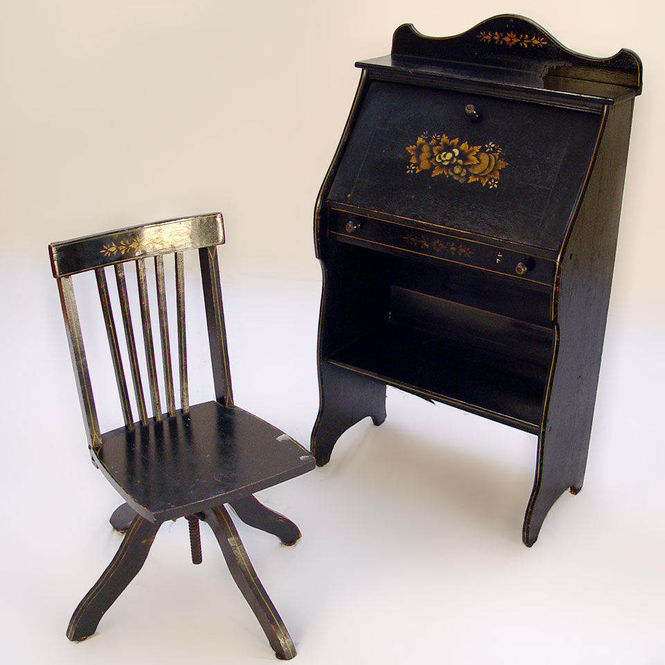 CHILD'S OAK SLANT FRONT DESK & CHAIR: Stenciled design on ebony finish. Interior of desk has pigeon holes just like the big ones. Sold with the matching junior size swivel desk chair. Desk is 37 1/2'' x 21'' x 12''.