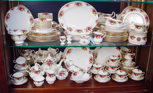 ROYAL ALBERT OLD COUNTRY ROSES FINE CHINA: 88 pieces to include 14 dinner plates, 11 salad plates, 13 bread plates, 10 dessert bowls, 12 cups, 12 saucers, Teapot, coffee pot, 2 sets of creamers and covered sugar, extra open sugar, 2 egg cups, candy dish, potpourri burner, 2 oval vegetable bowls, gravy with underplate, and a 13 3/4'' platter.