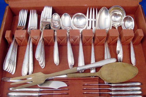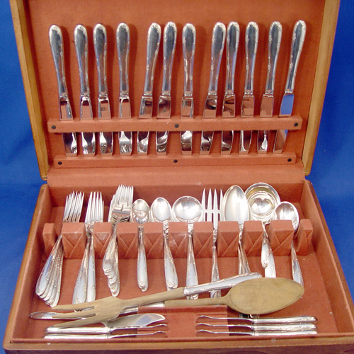 TOWLE ''MADEIRA'' STERLING FLATWARE SERVICE: 81 pieces with plenty of serving pieces to include 12 dinner knives, 12 dinner forks, 11 salad forks, 12 teaspoons, 7 soup spoons, a master butter, 7 butter spreaders, 2 sugar shells, 2 piece salad servers, 2 serving spoons, a meat fork, gravy ladle, and sauce ladle. No monogram, sold with the wood box.