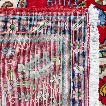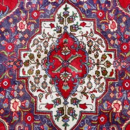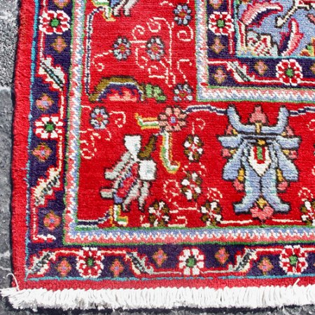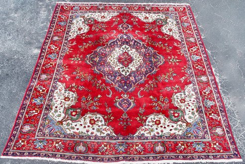 HAND TIED ROOM SIZE ORIENTAL CARPET: Approx. 12'x 9', red ground with central blue medallion.