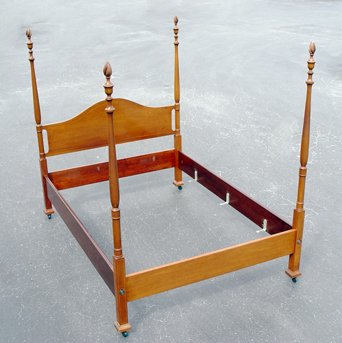 BIGGS FURNITURE MAHOGANY POSTER BED: String inlay mahogany bed by Biggs Of Richmond VA. Respected for fine reproductions of American Colonial furnishings Biggs was purchased by Kittinger in the 1970's. Full size bed with 72'' posts ending in flame finials. ''Biggs'' stamp behind the headboard.