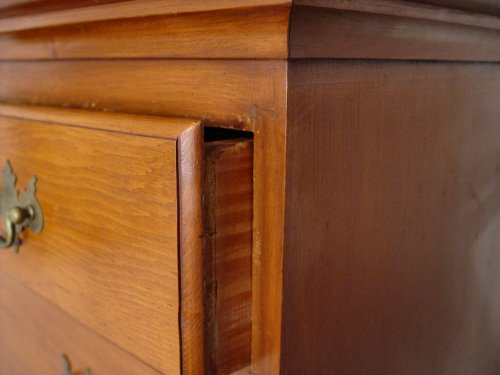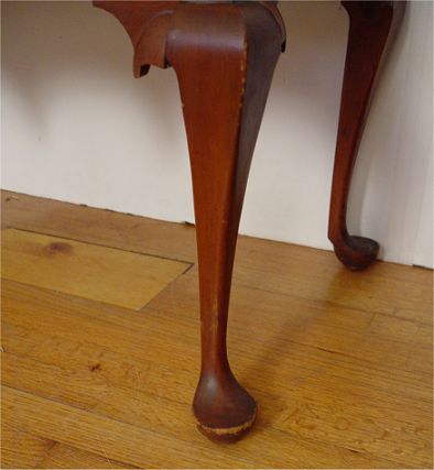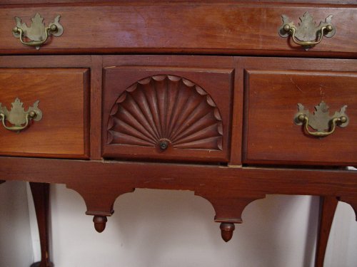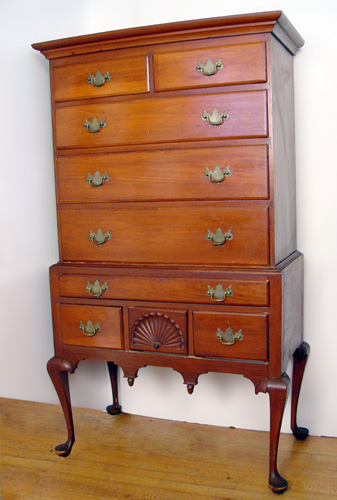 CENTENNIAL QUEEN ANNE HIGHBOY: Two piece, large dove tail construction, simple lines, acorn drop finials at center of apron, assorted chips and bangs from normal use, 63 5/8''h. x 37''w. at knees, 20 1/2'' at deepest.