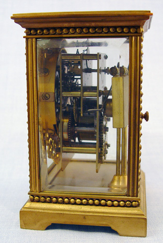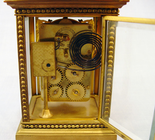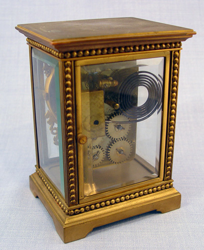 WATERBURY CARRIAGE CLOCK: Brass case with beveled glass. Enamel dial, iridized hands, dial and works are signed Waterbury. Please note there is some loss of brass trim, visible in the photo along the door. The glass is excellent. 6 1/2'' x 4 3/4'' x 4''.
