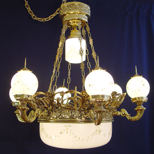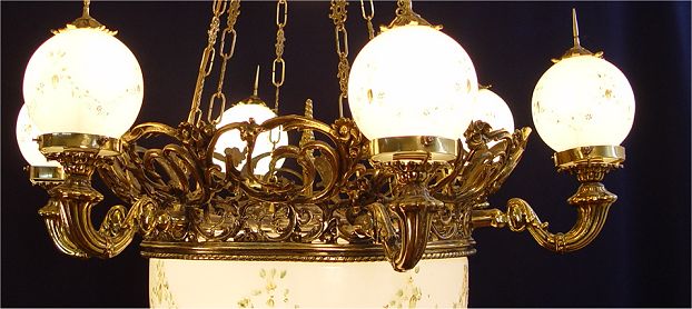 VICTORIAN ROCAILLE 8 LIGHT CHANDELIER WITH HAND PAINTED GLASS SHADES: Hangs approx. 33'' from the canopy. The shades are delicately hand painted with roses.