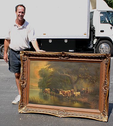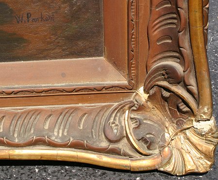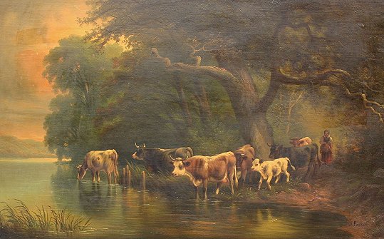 LARGE AMERICAN PAINTING COWS CROSSING STREAM CIRCA 1900: 30'' x 48'', O/B, signed W. Parker, ornate period frame with wear, 41'' x 61''. Needs cleaning. Est. $1200/1800**
