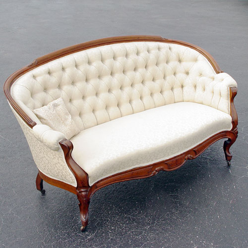 WALNUT VICTORIAN SOFA: Gently curved top rail, carved skirt and legs, button and tufted back. Upholstery is ready for home or shop. 68''long x 38 1/2''h.