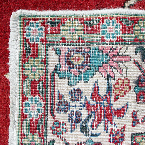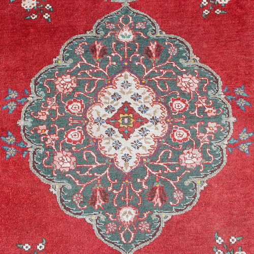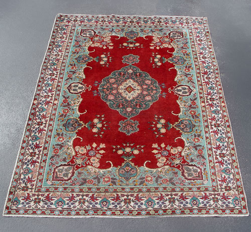 HANDWOVEN ORIENTAL CARPET: Approx. 10'6'' x 7'6'', red ground with center medallion and celadon edging, three floral borders.