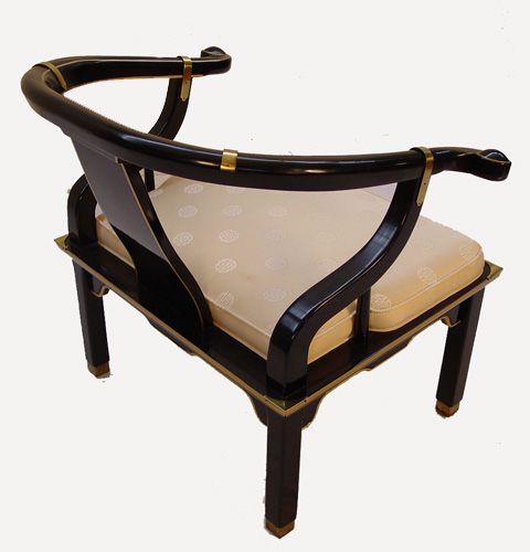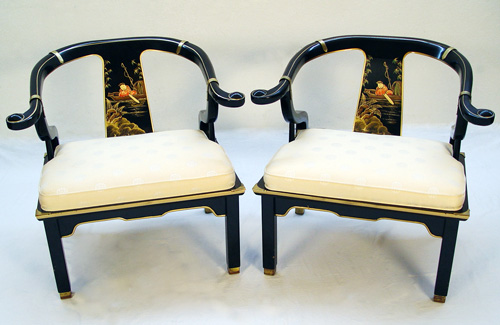 PAIR OF CHINESE STYLE BLACK LACQUER CHAIRS: Century Chair Co. Hickory NC. Hand painted Chinoiserie on black ground, brass banded. 29 1/2''h. x 27'' x 22 1/2'' deep.