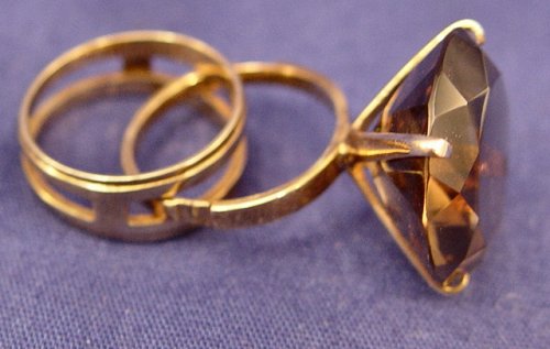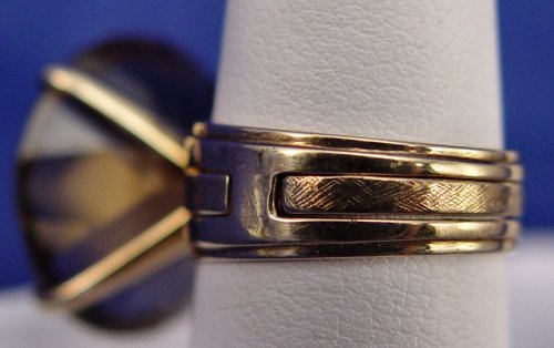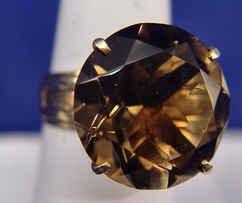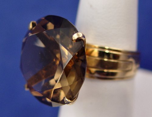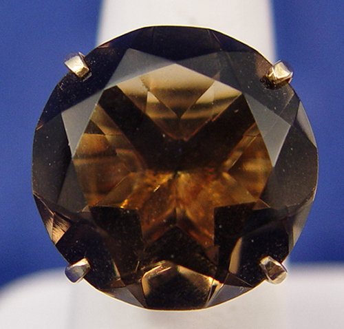 PALATIAL SMOKY QUARTZ RING: Giant round brilliant cut stone measuring approx. 20mm diameter and 10mm depth, prong mounted in 18k yellow gold ring with jacket, size 6.5, 9 grams.